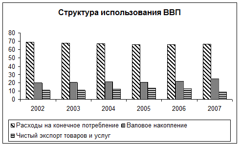Как показывают приведенные данные расходы на конечное потребление с 2002г. по 2006г. уменьшаются. А уже в 2007г. расходы начинают увеличиваться. Валовое накопление с каждым годом растет, и если 2002 г. оно составляло 20,1%, то в 2007г. – 24,7%. Чистый экспорт товаров и услуг с 2002г. по 2005г. растет, а с 2006 г. уменьшается и составляет 12,8%, в 2007г. – 8,8%. Эти изменения отражены в гистограмме: