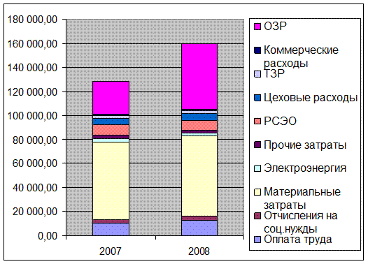 Из приведенных выше данных можно сделать вывод, что увеличение себестоимости 1 тн автопружин за 2007-2008 гг. произошло, во–первых, из-за перераспределения затрат в структуре себестоимости (увеличение доли и общей суммы постоянных расходов), а во-вторых, из-за увеличения суммы затрат практически по каждой статье себестоимости, то есть общее увеличение расходов на производство продукции. Наглядно изменение структуры затрат представлено на рисунке 9.