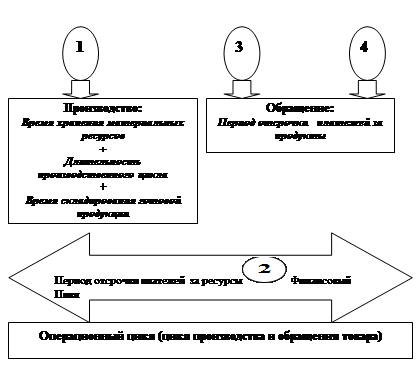1.2 Экономические нормативы управления финансовым циклом организацииИзвестно, что стратегическая цель увеличения стоимости бизнеса достигается в процессе управления финансовыми потоками организации при максимальном сокращении финансового цикла. Финансовый цикл - это период обращения денежной наличности, время, в течение которого денежные средства отвлечены из оборота, средний интервал между моментом текущих вложений (отток) и моментом поступлений (приток). Узловые моменты финансового цикла представлены на рис. 1.