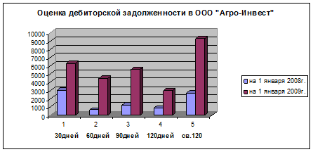 Рис. 1. Оценка состояния дебиторской задолженности в ООО «Агро-Инвест» Тенденция изменения дебиторской задолженности во времени показывает, как идет процесс старения задолженности и какова степень риска неплатежеспособности покупателей. По диаграмме можно судить, в какой период фирма ослабила внимание к дебиторам, в результате чего сумма долга возросла или осталась на прежнем уровне. Анализ диаграммы показывает на необходимость эффективной работы по взысканию дебиторской задолженности, имеющей более 120 дней со времени образования. Изучая историю возникновения дебиторской задолженности, произведена группировка по времени их возникновения. Чуть более 1/3 части дебиторской задолженности возникают в течение отчетного месяца и более 77% долга, числящиеся на счетах бухгалтерского учета за 2008г. и имеют срок возникновения до 120 дней, и только 23% задолженности превышают четырехмесячный срок их возникновения. На 1 января 2009 года эта сумма достигает 6333 тыс. руб. Данные о состоянии дебиторской задолженности в ООО «Агро-Инвест» сведены в табл. 5. Таблица 3 Состояние дебиторской задолженности в ООО «Агро-Инвест» на 1 января 2009г.