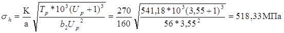 где К = 270 - для косозубых передач 103 - численный коэффициент согласования размерностей Принимаем согласно единого ряда главных параметров [1, с. 51], а = 140 мм Ширина колеса: b2 = a Ya = 140 *0,4 = 56 мм Принимаем b2 = 56 мм Фактическая окружная скорость: V = 2apn1 / ((Uр +1) 60) = 2* 140 *p* 325,89 /(3,55+1)60 = 1,05 м/c Уточняем Kh по [1, рис. 4.7, с. 92]: Kha » 1,1 Проверка по контактным напряжениям [1] ф. (4.41) с. 98