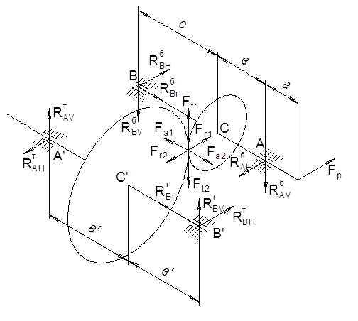 Т. к. колеса нарезаны без смещения исходного контура, для шестерни и колеса Х = 0. 2.3.5 Силы в зацеплении цилиндрической передачиСилы в зацеплении цилиндрической передачи определяем согласно [1] § 4.9 с. 109 Осевая сила Fa = Ft tg(b) = 3716 * tg( 11,38 °) = 747,64 H Радиальная сила Fr = Ft tg(a)/cos(b) = 3716 *tg(20°)/cos( 11,38 °) = 1380 H 3.3.6 Силы в ременной передаче Скорость движения ремня при диаметре быстроходного шкива D = 100 мм: Vр = p nном D/60 = p× 730 ×0,1/60 = 3,82 м/с. Угол охвата a1 = 150°, число ремней Z = 3, масса 1 м длины ремня Б: q = 0,18 кг/м. Коэффициент длины ремня CL = 0,92 [2, табл. 6.14, с 215]. Коэффициент охвата Сa = 0,92 [2, табл. 6.13]. Коэффициент режима работы Ср = 1 [2, табл. 6.5]. Сила натяжения одного клинового ремня: F0 = 780 N CL /(Vр Ca Cp Zр ) + q Vр 2 = = 780× 4,24 × 0,92 /( 3,82×0,92×1×3) + 0,18×3,822 = 288,36 Н Сила, действующая на вал: Fp = 2 F0 Z sin(a1 /2) = 2× 288,36 ×3×sin(150/2) = 1671 Н 3. Расчет валов, подбор подшипников3.1 Предварительный расчет валовОпределяем диаметры выходных концов валов из расчета на кручение. Материал валов - сталь 40Х ГОСТ 4543-88. d = (T*10 3 /0,2 [tk ]) 0,33 (5.1) Где [tk ] = 45 МПа - допускаемое касательное напряжение [2, стр. 249] d - в мм Хвостовик первичного вала: dхв.1 = (118,08*10 3 /0,2*45) 0,33 = 23,59 мм. Принимаем диаметр хвостовика быстроходного вала равным 0,8 диаметра вала электродвигателя d1 = 25 мм. Хвостовик тихоходного вала: dхв.3 = (405,93*10 3 /0,2*45) 0,33 = 35,60 мм. Принимаем диаметр хвостовика тихоходного вала 38 мм. Диаметры участков валов в месте посадки зубчатых колес определяем согласно [1, §11.2]: d > (16 T / p [t]) 1/3 Где Т - крутящий момент в Н/мм [t] = 16 МПа [1] d1 > (16* 118,08 /p*16)1/3 = 33,50 мм, принимаем d1 = 38 мм d2 > (16* 405,93/p*16)1/3 = 50,56 мм, принимаем d2 = 55 мм 3.2. Эскизная компоновка валовВыполняем эскизную компоновку валов при разработке сборочного чертежа редуктора. Принимаем предварительно для быстроходного вала подшипники 7207 ГОСТ 333-79, для тихоходного вала редуктора подшипники 7210 ГОСТ 333-79. 3.3 Проверочный расчет валов3.3.1 Схема приложения сил к валам