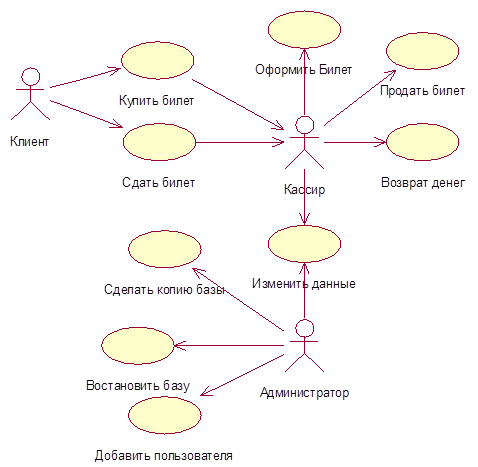 1.4.3 Ресурсы1. Технические средства: 1.1. Процессор Intel Pentium 3 800 Mгц; 1.2. RAM 384 Мб; 1.3. Видеокарта NVIDIA Geforce 4 MX 440 with AGP8x; 2. Программное обеспечение: 2.1. Операционная система Windows XP Professional SP2; 2.2. Borland Delphi 7.0; 2.3. СУБД: MSSQL Server 2000 developer edition; 2 Модель прецедентов ( Use Case) Программное приложение, включающее в себя своих пользователей. 2.2 Идентификация основных исполнителей · Пассажир – человек, который хочет воспользоваться услугами автовокзала; · Кассир – сотрудник организации, который обслуживает клиентов (пассажиров) доступ к просмотру и изменению информации; · Администратор базы данный – сотрудник организации, занимающийся администрированием системы. 2.3 Задачи каждого исполнителя · Пассажир - оплатить поездку; · Кассир – обслужить клиента; · Администратор – обслуживание системы и базы данных(резервное копирование, восстановление, добавление новых пользователей). 2.4 Основные и альтернативные потоки Основной поток 1 · Клиент приходи на автовокзал и хочет взять билет на определенную дату; · Кассир ищет в окне приложения заданный рейс; · Кассир открывает окно продажи билета и вводит сумму и дату рейса; · Клиент передает деньги кассиру; · Кассир делает заказ и отдает билет. Основной поток 2 · Клиент в силу сложившихся обстоятельств не может совершить поездку на заранее купленный билет; · Кассир делает отмену заказа и отдает деньги с учетом штрафа. Альтернативный поток 1 · Клиент приходи на автовокзал и хочет взять билет на определенную дату; · Кассир обнаруживает, что на данную дату нет мест и предлагает выбрать на другой день. Альтернативный поток 2 · Клиент приходи на автовокзал и хочет взять билет на определенную дату; · Клиент обнаруживает, что ему не хватает наличных. 2.5 Диаграмма Use Case