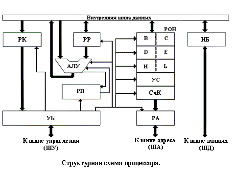 где r и k - соответственно количество разрядов, используемых для представления порядка и мантиссы. Третья форма представления двоичных чисел - двоично-десятичная. Ее появление объясняется следующим. При обработке больших массивов десятичных чисел (например, больших экономических документов) приходится тратить существенное время на перевод этих чисел из десятичной системы счисления в двоичную для последующей обработки и обратно -для вывода результатов. Каждый такой перевод требует выполнения двух - четырех десятков машинных команд. С включением в состав отдельных ЭВМ специальных функциональных блоков или спецпроцессоров десятичной арифметики появляется возможность обрабатывать десятичные числа напрямую, без их преобразования, что сокращает время вычислений. При этом каждая цифра десятичного числа представляется двоичной тетрадой. Например, A10 =3759, A2-10 = 0011 0111 0101 1001. Положение десятичной точки (запятой), отделяющей целую часть от дробной, обычно заранее фиксируется. Значение знака числа отмечается кодом, отличным от кодов цифр. Например, “+” имеет значение тетрады “1100”, а “-” - “1101”. ЭВМ первых двух поколений могли обрабатывать только числовую информацию, полностью оправдывая свое название вычислительных машин. Лишь переход к третьему поколению принес изменения: к этому времени уже назрела настоятельная необходимость использования текстов. С точки зрения ЭВМ текст состоит из отдельных символов. К числу символов принадлежат не только буквы (заглавные или строчные, латинские или русские), но и цифры, знаки препинания, спецсимволы типа "=", "(", "&" и т.п. и даже (обратите особое внимание!) пробелы между словами. Да, не удивляйтесь: пустое место в тексте тоже должно иметь свое обозначение. Каждый символ хранится в виде двоичного кода, который является номером символа. Можно сказать, что компьютер имеет собственный алфавит, где весь набор символов строго упорядочен. Количество символов в алфавите также тесно связано с двоичным представлением и у всех ЭВМ равняется 256 . Иными словами, каждый символ всегда кодируется 8 битами , т.е. занимает ровно один байт . Как видите, хранится не начертание буквы, а ее номер. Именно по этому номеру воспроизводится вид символа на экране дисплея или на бумаге. Поскольку алфавиты в различных типах ЭВМ не полностью совпадают, при переносе с одной модели на другую может произойти превращение разумного текста в "абракадабру". Такой эффект иногда получается даже на одной машине в различных программных средах: например, русский текст, набранный в MS DOS, нельзя без специального преобразования прочитать в Windows. Остается утешать себя тем, что задача перекодировки текста из одной кодовой таблицы в другую довольно проста и при наличии программ машина сама великолепно с ней справляется. Наиболее стабильное положение в алфавитах всех ЭВМ занимают латинские буквы, цифры и некоторые специальные знаки. Это связано с существованием международного стандарта ASCII (American Standard Code for Information Interchange - Американский стандартный код для обмена информацией). Русские же буквы не стандартизированы и могут иметь различную кодировку. Желающие могут в качестве примера ознакомится с таблицей стандартной части алфавита ЭВМ - символы с шестнадцатиричными кодами с 20 до 7F. 7. Структурная схема микропроцессора. Главным устройством любой