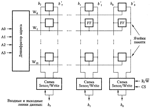 Максимальная длительность чтения-записи называется временем обращения к памяти. По физическим основам все запоминающие устройства разделяются: полупроводниковые, магнитно-оптические и т.д. Организация полупроводниковой памятиС точки зрения функционального построения, любое запоминающее устройство такого типа представляет собой некоторый массив элементов памяти. Структурные элементы памяти образуют ячейки памяти. Ширина ячеек - ширина выборки из памяти. Структура модуля памяти определяется способом организации памяти (способ адресации). Существует 3 разновидности организации памяти: