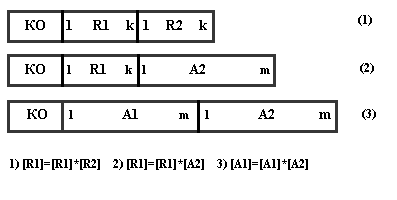 Схема выполнения трехадресной команды: [А3]:=[А1]*[А2]. Содержимое ячейки с адресом А1 - [А1] (первый операнд) и содержимое ячейки с адресом А2 - [А2] (второй операнд), извлеченные из памяти, вступают в операцию *, заданную полем КО, и результат операции пересылается (записывается) в ячейку памяти с адресом А3. В общем случае, в зависимости от количества адресных полей, принято различать команды: безадресные, одноадресные, двухадресные, трехадресные. Кроме того, в процессорах применяют команды различных форматов в зависимости от уровней памяти, т.е. в зависимости от того, адрес какого типа указан в адресной части команды - адрес типа R, в котором указывается номер РОН, или адрес типа А – номер ячейки ОП. Отсюда различные типы форматов: RR – команды типа регистр-регистр, RM – команды типа регистр-память, MM - команды типа память-память. Примеры двухадресных команд типов RR (1), RM (2), MM (3) :