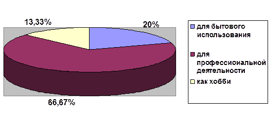 Можно сказать, что для опрошенных (35% из числа опрошенных респондентов), не занимающихся портным делом, цвет и дизайн имеют значение. В свою очередь, для большинства портних в возрасте от 31 и старше (50 % опрошенных) данный параметр не имеет значение, как было сказано ранее, они будут выбирать швейную машинку исходя из ее технологических характеристик. Это качество товара будет иметь значение только для портних в возрасте от 19 лет до 30 (15 % опрошенных). Для каких целей Вы приобретаете швейную машину?