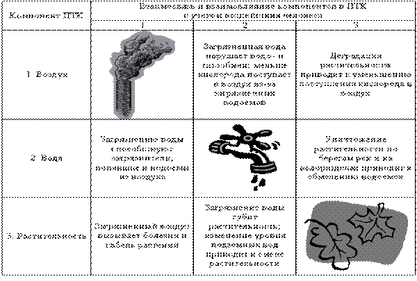 ¾ После заполнения таблицы ребята на контурных картах отмечают районы с данными экологическими ситуациями. ¾ Презентация проектов, которые могли бы изменить ситуацию в лучшую сторону. ¾ Обсуждение проектов. В процессе обучения использую межпредметные связи, которые способствуют осуществлению всех дидактических принципов, усиливая их взаимодействие. Их действие способствует формированию системы знаний, обобщенных познавательных умений, развитию познавательных интересов. Например, при изучении темы «Население» в 9 классе, выполняем следующее задание: основным гигиеническим нормативом в нашей стране является показатель предельно допустимых концентраций (ПДК). Подчеркните правильный ответ: ПДК – это: а) степень воздействия источника выбросов техногенных веществ в природную среду; б) такая концентрация химического соединения, которая при ежедневном воздействии на организм человека в течение длительного времени не вызывает патологических изменений или заболеваний; в) обмен выбросов вредных веществ, обеспечивающих качество природной среды в соответствии с гигиеническими и экологическими требованиями. Поскольку качество среды оценивается с позиций интересов человека, попробуйте самостоятельно сформулировать ваши требования к качеству городской среды. Расположите их по степени важности и дайте краткую характеристику каждого критерия. На своих уроках использую информационные технологии, мультимедийные комплекты. Информатика позволяет школьникам взглянуть на предмет с «информационной», «алгоритмической» точки зрения, что приводит к углублению и систематизации знаний учащихся, появлению новых ассоциативных связей. При подготовке к урокам использую мультимедиа, что позволяет мне сократить время на поиск дополнительного материала, иллюстраций звукового оформления к интересующей меня теме, также создаю и использую созданные обучающимися презентации. В учебной деятельности учащихся широко использую комплексные географические практикумы, межпредметные семинары и конференции, организую проектную деятельность учащихся, направленную на решение географических задач, в первую очередь геоэкологического и геоэкономического содержания.[17] Перспективным направлением, на мой взгляд, является использование в учебном процессе методов элементарного географического прогнозирования. Географический прогноз способствует более глубокому усвоению школьниками взаимосвязей в геосистемах, предсказанию возможных последствий их изменения человеком, выявлению оптимальных способов природопользования. Одним из приемов учебной работы является составление схематических моделей геосистем, подвергающихся воздействию человека.[18] В качестве примера элементарного географического прогнозирования на уроке и в других формах организации учебного процесса можно привести работу со схематическими моделями природных комплексов (рис. 4).