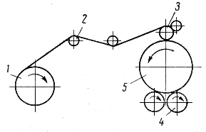 Рис. 2.2.3 Схема продольно-резательного станка с верхней заправкой с отдельно расположенными ножами и двумя бумаговедущими валами до и после механизма продольной резки; 1- разматываемый рулон; 2 - бумаговедущий вал; 3 - механизм продольной резки; 4 - несущий вал; 5 - наматываемый рулон; 6 – прижимной вал. На всех станках с верхней заправкой бумаги разматываемый рулон устанавливают на тамбурном устройстве, где имеется тормоз, создающий необходимое натяжение бумаги. Бумага заправляется сверху по бумаговедущим валикам и расправочной дуге, проходит через механизм продольной резки, огибает прижимной вал и наматывается на намоточный валик. Наматываемый рулон опирается на два приводных несущих вала. По мере увеличения диаметра наматываемого рулона ось его перемещается кверху. Одновременно с рулоном перемещаются прижимной вал и механизм продольной резки. Станки с нижней заправкой имеют много конструктивных решений. Чаще применяются следующие схемы станков: