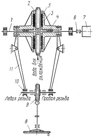 Рис. 2.3.2. Схема дискового тормоза продольно-резательного станка: 1- вал; 2 - корпус; 3 - диск; 4 - направляющая шпонка; 5 - прокладка; 6 - включающая муфта; 7 - тамбурный валик; 8 - маховик для прижима дисков; 9 - червячная передача; 11 - рычаг Натяжение бумаги будет постоянным при уменьшении тормозного момента по мере разматывания рулона. Для этого на механических тормозах необходимо вручную уменьшать усилие прижима дисков, что осложняет эксплуатацию станка. При обрыве полотна бумаги тормозной момент необходимо быстро вручную увеличить до максимально возможного предела. Вакуумный тормоз представляет собой ящик, в котором создается вакуум 0,19 – 0,39 кПа. Бумажное полотно, проходящее над ящиком, под действием вакуума прижимается к его поверхности. Натяжение бумаги не зависит от радиуса разматываемого рулона и остается постоянным при неизменном вакууме. Следует учесть. Что, кроме вакуумного тормоза, необходимо установить еще и механический тормоз для торможения разматываемого рулона при обрыве бумаги Наилучшим является электрическое торможение, осуществляемое генератором постоянного тока, соединенным с тамбурным валиком разматываемого рулона. Тормозной генератор (рис. 2.3.3) при постоянной линейной скорости бумаги развивает постоянную мощность независимо от угловой скорости рулона и поддерживает постоянное натяжение полотна.