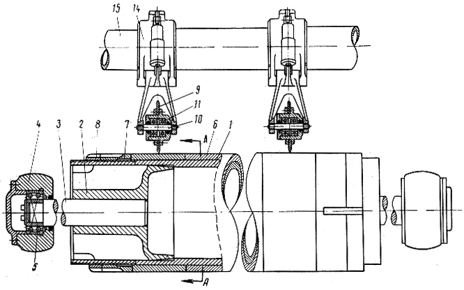 Рис. 2.3.5. Резка давлением: 1 – труба ножевого вала; 2 – патрон; 3 – цапфа; 4 – корпус подшипника; 5 – подшипник; 6 – ножевое кольцо; 7 и 8 – гайка и контргайка ножевого вала; 9 – верхний дисковый нож; 10 – ось верхнего ножа; 11 – подшипники верхнего ножа; 12 – рычаг верхнего ножа; 13 – пружина для прижима ножа; 14 – кронштейн верхних ножей; 15 – труба для установки кронштейнов Ножевой вал – трубчатый, на него надеты стальные закаленные кольца высокой твердости. На станках с верхней заправкой ножевой вал, одновременно являющийся и прижимным, лежит на рулоне, приводящем его во вращение. На станках с нижней заправкой ножевой вал приводится во вращение от несущего вала, иногда для привода ножевого вала устанавливают отдельный электродвигатель. Метод резки по принципу ножниц, обеспечивающий более чистый и гладкий рез и большую износоустойчивость ножей, распространен больше, чем метод резки давлением. При резке методом давления затруднен подбор соотношения величин твердости колец и дисковых ножей. Если твердость колец выше твердости ножей, последние затупляются. При обратном соотношении величин твердости на кольцах образуются риски. Чашечные и дисковые нож изготовляют из хромоникелевой стали, обладающей высокой износоустойчивостью. Твердость чашечных ножей по Роквеллу Rc = 58 60, дисковых Rc = 53 55. При резке бумаги без наполнителя ножи затачивают через 4 – 8 месяцев. При наличии в бумаге наполнителей срок службы ножей сокращается более чем вдвое. Компоновка станка в значительной степени зависит от принятого метода резки. При резке по принципу ножниц бумага не может охватывать ножевой вал, на котором в отдельных местах расположены чашечные ножи. В этом случае независимо от вида заправки (верхней или нижней) необходимо, чтобы бумажное полотно при разрезании находилось в натянутом состоянии на прямом участке. Что достигается установкой двух валиков: бумаговедущего – до ножей, и прижимного – после них (на станке с верхней заправкой) или двух бумаговедущих валиков (на станке с нижней заправкой). При резке по методу давления бумага может охватывать нижний ножевой вал, на котором по всей его длине надеты кольца. В этом случае количество бумаговедущих валиков уменьшается на один или два. Преимущества ножевого вала особенно заметны на станках с верхней заправкой, где механизм продольной резки расположен над наматываемым рулоном и перемещается кверху по мере увеличения диаметра рулона. При резке по методу ножниц бумаговедущий и прижимной валы увеличивают размеры и вес перемещающихся узлов. Ножевой вал на станках с верхней заправкой осуществляет и функцию прижимного, вследствие чего число валов уменьшается и упрощается компоновка станка. Для использования при компоновке станка преимуществ резки по методу ножниц и ножевого вала создана конструкция ножевого вала, на кольцах которого имеется семь - восемь ножевых канавок (рис. 2.3.6) (при наличии семи-восьми ножевых канавок, используе -
