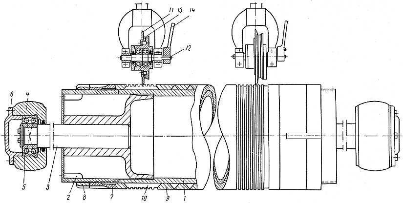 Рис. 2.3.6 Ножевой вал: 1 – труба ножевого вала; 2 – патрон; 3 – цапфа; 4 – корпус подшипника; 5 – подшипник качения; 6 – крышка подшипника; 7 и 8 – затяжная гайка и контргайка ножевого вала; 9 – сплошное кольцо; 10 – разъемное ножевое кольцо; 11 – верхний дисковый нож; 12 – ось дискового ножа; 13 – спиральная пружина для прижима ножа; 14 – рукоятка для выключения верхнего ножа мых поочередно, ножевые кольца можно шлифовать значительно реже, чем при обычных ножах). Верхний дисковый нож соприкасается с режущей поверхностью ножевой канавки. Кольца с ножевыми канавками (ножевые кольца) могут быть сплошными или разъемными. Разъемные ножевые кольца заканчиваются коническими или цилиндрическими хвостовиками, входящими в выточки сплошных колец. Всю систему разъемных ножевых и сплошных колец закрепляют на валу при помощи затяжных гаек. При изменении формата бумаги затяжные гайки отвинчивают на двойную длину хвостовика, снимают разъемные ножевые кольца, сдвигают сплошные кольца и устанавливают ножевые кольца в необходимых местах по длине вала. Однако изготовление и шлифовка разъемных ножевых колец весьма сложны. Поэтому часто их делают сплошными, а промежуточные кольца – разъемными. На новых продольно – резательных станках сплошные ножевые кольца закрепляют при помощи шпонок, перемещающихся под давлением пневматических шлангов (рис. 2.3.7) Ножевые кольца установлены по всей длине вала. Зазор между кольцами равен 8 – 10 мм. Так как на кольцах имеется семь – восемь ножевых канавок, то при смещении колец на величину зазора можно разрезать полотно бумаги на рулоны нужной ширины. При разрезании пухлой бумаги малого объемного веса на станках с верхней заправкой канавки ножевого вала, опирающегося на наматываемый рулон, оставляют на бумаге отпечатки. Поэтому для такой бумаги устанавливают отдельный прижимной вал, от которого приводится во вращение ножевой вал при помощи клиноременной передачи. Механизм продольной резки располагают как можно ближе к наматываемому рулону. Этим избегается возможное боковое смещение разрезаемых полос бумаги при их движении. При смещении полос кромки полотен бумаги нахлестываются друг на друга, что затрудняет разделение рулонов. Иногда во избежание указанного смещения полос перед наматываемым рулоном устанавливают разделители (тонкие пластинки) или сферические наконечники, которые способствуют лучшему разделению рулонов.