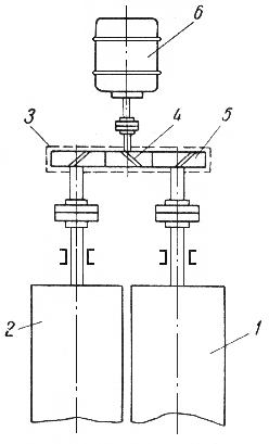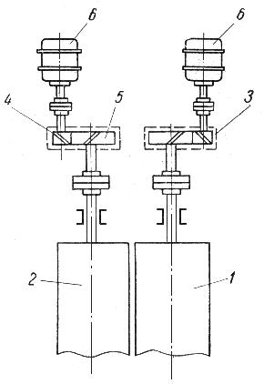 Рис. 2.3.9. Привод несущих валов от одного электродвигателя: 1 и 2 – первый и второй несущие валы; 3 – редуктор; 4 и 5 – ведущая и ведомая шестерни; 6 – электродвигатель редуктора, приводная шестерня которого соединена одновременно с двумя зубчатыми колесами, надетыми на цапфы несущих валов. Большая плотность намотки рулонов достигается при скорости второго по ходу бумаги несущего вала, несколько превышающей (на 1-2%) скорость первого несущего вала.