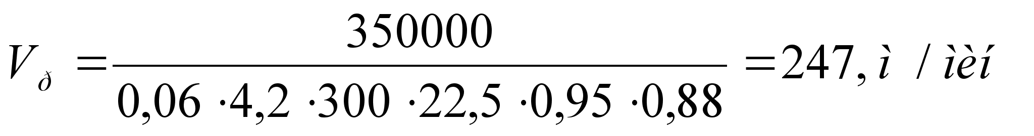 где: Q – производительность машины, кг/сут, Q = 350000 кг/сут b – ширина полотна на накате, м, b = 4,2 м q – масса 1 м2, г/м2, q = 300 г/м2 k1 – коэффициент загрузки работы машины в течение суток (число часов фактической работы, обычно k1 = 22,523), ч, k1 =22,5 k2 – коэффициент использования рабочего хода машины (учет холостых ходов k2 = 0,950,98), k2 = 0,95 k3 – коэффициент выхода нетто товарной продукции из брутто всей машинной продукции (учет оборотного брака, k3 = 0,880,98), , k3 = 0,88