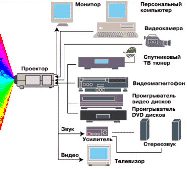 | 2 . Проектирование видеокомплексов. 2.1 Обоснование выбора LCD – проекторов. Данный зал кинотеатра можно использовать не только доля показа кинофильмов, но и производить презентации, различные программы, тематические встречи, а также, для улучшения обслуживания посетителей и демонстрации видеофильмов и видео рекламы фильмов, можно оборудовать зал стационарной системой видео комплекса. Для этого зал необходимо оснастить мультимедийным проекторов. LCD видеопроектор - прекрасная альтернатива большеэкранным телевизорам. Он создает яркую картинку размером 0.7-12 метров с глубоким цветом и отличной четкостью - до 550 горизонтальных линий (стандарт обычного видеомагнитофона VHS - 240 линий). Совместимость с наиболее популярными видеостандартами PAL, SECAM, NTSC позволит Вам просмотреть любую телевизионную программу, лазерный диск, видеокассету. Возможность подключения к компьютеру позволяет использовать видеопроектор для проведения презентаций, в учебном процессе, для контроля технологических процессов. Проектор настолько прост в управлении, что не требует специальных навыков. Высокая яркость и специальные экраны дают возможность проводить демонстрации в большом незатемненном помещении. Компактность и мобильность позволяют использовать проектор в любом месте. В видеопроекторах устройство формирования светового сигнала состоит из источника света (лампы ), жидкокристаллической матрицы и объектива. Широкий параллельный пучок световых лучей от источника, сформированный конденсором, направляется на жидкокристаллическую матрицу, каждый элемент которой выступает в роли светового клапана. На выходе жидкокристаллической матрицы формируется цветное изображение. Которое переносится проекционным объективом на зрительный экран. Привлекательность видеопроекторов ещё и в том, что у них имеется большое число входов для различных видео сигналов и встроенный коммутатор для этих сигналов. Это даёт возможность подключить к нему различные видео устройства с различными стандартами видеосигналов. Схема и виды соединения представлены на рисунке 2.1.1. Рисунок 2.1.1