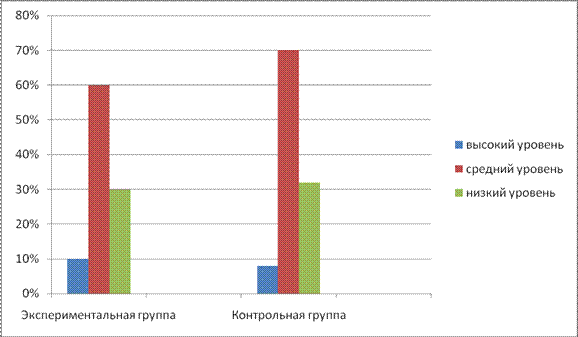 Диаграма 1. В процентном соотношении уровни развития детей в контрольной и экспериментальной группах представлено в Таблице 1. Из таблицы видно, что разница в обеих группах незначительная и даже в контрольной группе уровень творческого рассказывания старших дошкольников Дайте приличный качественный анализ рассказов детей Для детей обеих групп оказалось очень сложным задание, где предлагалось самостоятельно придумать сказку, которое было выполнено на низком уровне. ПОЧЕМУ ЭТО ОКАЗАЛОСЬ ТРУДНЫМ, С ЧЕМ НЕ СПРАВИЛИСЬ ДЕТИ? Дети знают много сказок, предлагают свои варианты концовок, но сочинить свой рассказ им сложно. Дошкольники допускали ошибки в образовании разных грамматических форм ("бежу" к маме), у них вызывало затруднение правильное построение предложений, так как в этом возрасте данные умения начинают формироваться. Некоторые дети употребляют слова и выражения, неточно понимая их смысл. Это говорит о том, что у них сравнительно небольшой активный словарь при наличии значительного пассивного словаря. Некоторые дети, верно произнося звуки, затрудняются в различении их на слух, что может привести в дальнейшем к трудностям в овладении грамотой. Это связано и с возрастными индивидуальными особенностями и недостаточной работой педагога по развитию у детей звуковой культуры речи. Дайте примеры рассказов детей разных уровней! Таким образом, мы выяснили, что работа по использованию современных литературных сказок со старшими дошкольниками организована недостаточно. Родители и педагоги не используют полностью их развивающий потенциал, в том числе и для развития речи. Итак, мы еще раз убедились в том, что комплексная методика развития речи детей старшего дошкольного возраста средствами современной литературной сказки просто необходима. Выводы 2.2. Содержание и методика использования современной литературной сказки в развитии творческого рассказывания детей. Формирующий этап экспериментальной деятельности проводился на протяжении трех месяцев и проходил в два этапа. В ходе первого (ознакомительного) этапа формирующего эксперимента проводилось чтение и обсуждение литературных сказок современных писателей (произведений Джанни Родари, Пьера Грипари, Жака Превера) во второй половине дня. Старшим дошкольникам читались следующие сказки: Д.Родари: «Большая морковка», «Дудочник и автомобили», «Волшебный барабан», «Хитрый Буратино», «Дерево на котором растут туфли», «Как лису хоронили», «Страна без ошибок», «Дети и куклы» Джанни Родари; Пьера Грипари : «Добрый маленький чертёнок», «История пары туфель», «Дом дядюшки Пьера» Жак Превер : «Страус», «Морской слон», «Недовольный Дромадер». С помощью чтения отобранных сказок мы стремились разрушить у дошкольников стандарт восприятия сказочного произведения, разнообразить сюжеты детских сочинений, уделяли внимание работе над смысловой стороной слова, формировали умение употреблять слова, наиболее точно подходящие к ситуации, формировали навыки пересказа (понравившегося отрывка, всего произведения, с продолжением, по ролям и т.д.). Так, при ознакомлении со сказкой Д.Родари «Большая морковка» мы учили дошкольников осмыслять идею произведения, понимать сходство и различие в построении сюжетов, в идеях похожих сказок (было предложено сравнить сказку Д.Родари «Большая морк