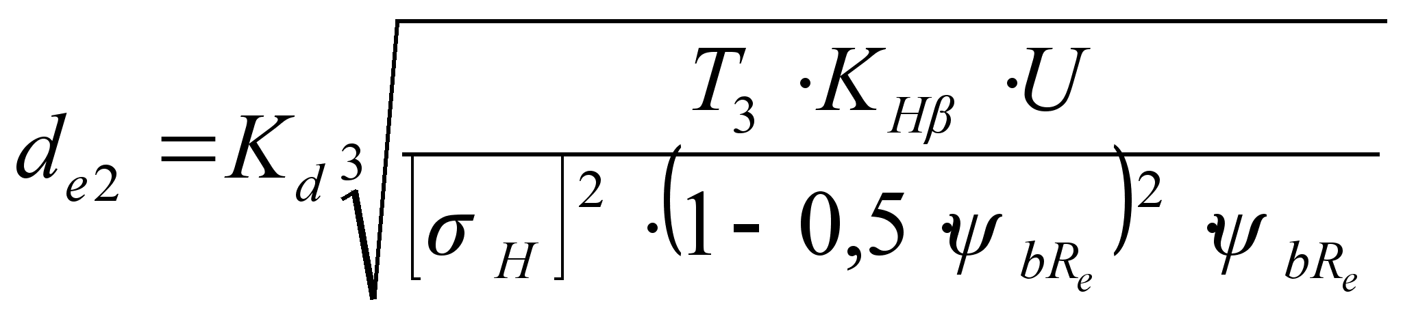 где Т3 – вращающий момент III вала, Т3=500 Нм; KHβ – коэффициент при консольном расположении шестерни 1,35; U – передаточное число, U=5; ψbRe – коэффициент ширины венца по отношению к внешнему конусному расстоянию, ψbRe=0,285; Кd –для прямозубых передач Кd = 99
