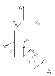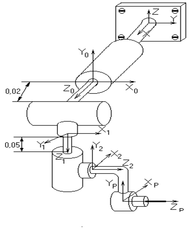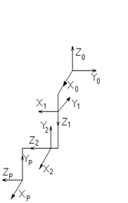 Рис.5 Упрощённая конструкция манипулятора со связанными системами координат Связанные системы координаты расставлены в соответствии с представлениями Денавита – Хартенберга. Система [X0 ,Y0 ,Z0 ] – связанная система координат 1-го звена [X1 ,Y1 ,Z1 ] – связанная система координат 2-го звена [X2 ,Y2 ,Z2 ] – связанная система координат 3-го звена [XР ,YР ,ZР ] – связанная система координат рабочего органа