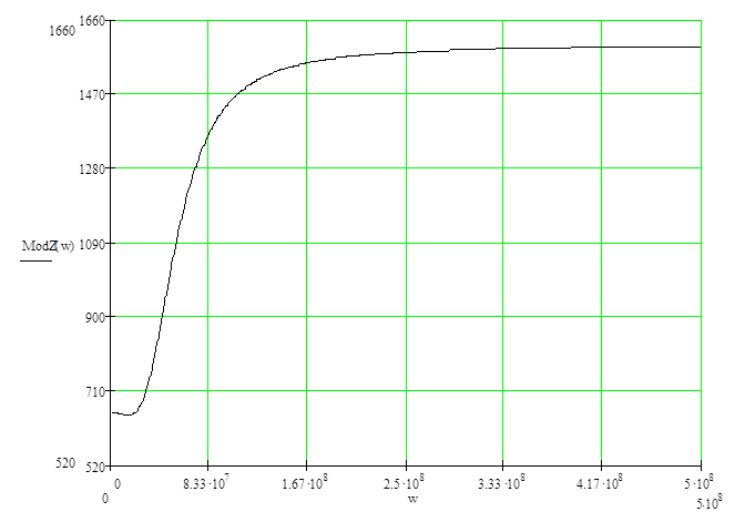 Рисунок 1.2‑ Зависимость реактивной составляющей от частоты; размерность X(w) – Ом, w – рад/с 1.4 Определение модуля комплексного входного сопротивления цепи Модуль комплексного входного сопротивления цепи: