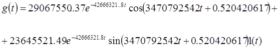 Рисунок 3.4 – Импульсная характеристика цепи в крупном масштабе; размерность t – сек, g(t) – безразмерная величина Оба графика имеют одну и ту же шкалу времени, поэтому можно оценить, насколько быстро затухают колебания, и во сколько раз уменьшается их амплитуда за ничтожный промежуток времени.