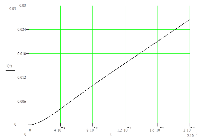 Рисунок 3.8 ‑ Отклик цепи при t – сек, i(t) – Ампер Поскольку данный график содержит ось времени от 0 до t1, да плюс, как мы увидели по переходной характеристике, затухание происходит очень быстро, увидеть в таком масштабе колебания нельзя. На рисунке 3.8 ось времени содержит значения от 0 и до 2*10^-7 секунд, на этом графике хоть и слабо, но все же видно, что нарастание вначале нелинейное. при
