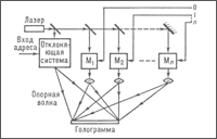 Рисунок иллюстрирует схему записи голограммы плоской волны (напомним, что плоская волна – это волна, амплитуда которой одинакова в любой точке пространства). Пусть на фоточувствительную среду Н падают две плоских когерентных волны равной интенсивности. Их когерентность достигается тем, что в качестве источника света используется лазер с подходящими свойствами, и его излучение делится с помощью специального делителя на два пучка. На фоточувствительной среде образуется интерференционная картина, имеющая вид параллельных периодических полос. Для того чтобы фоточувствительная среда зафиксировала интерференционную картину, ее разрешающая способность должна составлять более 1000 линий/мм. Интерференционная картина дифракции плоских волн, зарегистрированная на фоточувствительной среде, например, на фотопластинке, представляет собой хорошо известную дифракционную решетку. Если на решетку направить луч света в направлении, соответствующем одному из пучков при записи, например, 2 на рисунке, то в результате дифракции мы получим волну, распространяющуюся в том же направлении, что и волна 1 при записи. В действительности справа от пластинки мы увидим кроме волны 1 целый набор плоских дифрагировавших волн, соответствующих разным порядкам дифракции. Нулевой порядок, m =0, соответствует распространению падающей волны. Направление волны, отвечающей первому порядку дифракции m =1, точно соответствует направлению объектной волны 1 при записи, m =-1 – противоположному направлению под тем же углом. Дополнительные волны с порядком дифракции больше единицы возникают вследствие того, что ни одна реальная регистрирующая среда не может воспроизвести с высокой точностью распределение освещенности при записи, которое в нашем случае является синусоидальным. Описанный выше эксперимент показывает, что использование двух волн при записи позволяет регистрировать распределение фаз волны на поверхности и восстанавливать волну, участвовавшую в записи решетки, которая представляет собой простейшую голограмму.