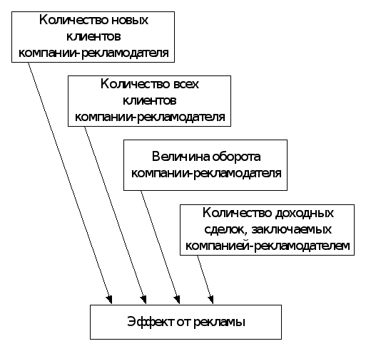 Анализ финансовой или коммерческой эффективности. Работы по анализу финансовой эффективности затрат на рекламу, как правило, проводятся внутри фирм структурными подразделениями рекламодателей. На практике широко применяется метод оценки финансовой (экономической) эффективности рекламы, основанный на отношении дополнительной прибыли, полученной в результате применения рекламы, к затратам на нее. Простейший метод определения финансовой (экономической) эффективности рекламных объявлений основывается на анализе результатов эксперимента, суть которого, в большинстве случаев, сводится к следующему: выбираются два или больше сопоставимых локальных рынка, на которых фирма осуществляет свою деятельность в течение определенного промежутка времени с различной степенью рекламной поддержки (при прочих равных условиях). Разница торговых результатов соотносится с разницей в объемах ассигнований на рекламу, на основании этого и делается вывод о величине вклада рекламы в изменение оборота фирмы. В большинстве случаев фирма, по различным причинам, не может позволить себе подобный «простейший» метод, но всегда в распоряжении фирмы есть экспертно-аналитические методы определения экономической эффективности рекламных акций или кампаний. Основная проблема в условиях неполного рынка – выделение с минимальной погрешностью «чистого эффекта рекламы», то есть определение той доли прироста объема сбыта или прибыли, которая была обеспечена исключительно рекламой в тот период, за который учитываются затраты на рекламу. [57] Для выделения «чистого эффекта рекламы» с целью дальнейшего определения экономической эффективности рекламы по методу «эффект/затраты» можно использовать следующую схему: Причины изменения объема оборота (прибыли) делятся на основную и прочие: основная причина – рекламная кампания фирмы текущего периода, прочие факторы изменения оборота и прибыли это: