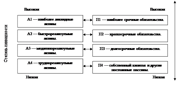 Условия абсолютной ликвидности баланса: А1≥П1, А2≥П2, АЗ≥ПЗ, А4≤П4 . При определении ликвидности баланса группы актива и пассива сопоставляются между собой (рис. 1).