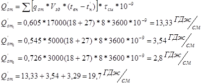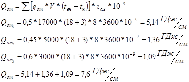 Где zсм от - число смен, в течение которых отапливаются здания предприятия (определяется по продолжительности отопительного периода); yот - коэффициент, учитывающий снижение расходов теплоты на отопительные нужды за счет прерывистого отопления в выходные дни и нерабочие смены (принимается равным 0.7 – 0.75). 6.4. Годовой расход теплоты на вентиляцию.