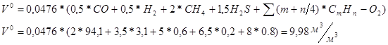 Где za - коэффициент запаса производительности (принимается равным 1.05); aт - коэффициент избытка воздуха в топке (для камерных топок при сжигании газа 1.2); V0 - теоретических расход воздуха для сжигания выбранного вида топлива при нормальных условиях, рассчитывается в соответствии с составом топлива;