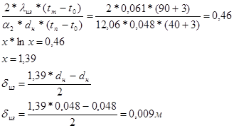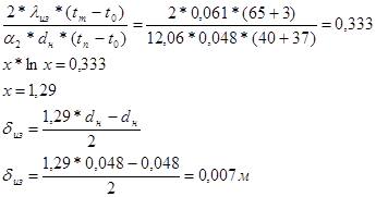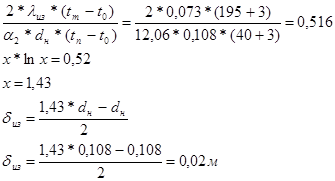 Где Ux – удельный объем горячей воды; Dc – максимальный секундный расход горячей воды. Выбираем dвн = 0,041 м, dст = 0,0035 м, dнар = 0,048 м 4.2. Расчет и подбор толщины тепловой изоляции теплопроводов. Толщина теплоизоляционного слоя наружных теплосетей определяется из уравнения. Пар: Выбираем для изоляции теплоизоляционные полуцилиндры из минеральной ваты lиз = 0,073 Вт /(м*К) .