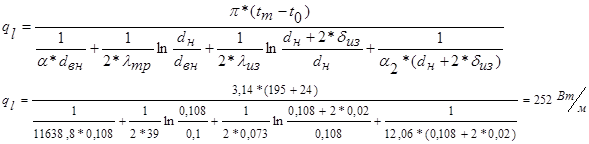 Где dн – наружный диаметр трубопровода; lиз - коэффициент теплопроводности тепловой изоляции tт , tп , t0 – соответственно температуры теплоносителя, поверхности изоляционного слоя и окружающего воздуха. a2 - коэффициент теплоотдачи от изоляционного теплопровода к окружающему воздуху. Коэффициент теплоотдачи от поверхности изолированного теплопровода к окружающему воздуху рассчитывается по эмпирической формуле.