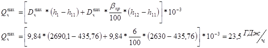 Где Dч max - максимальное потребление пара; h1 - энтальпия вырабатываемого пара; h11 - энтальпия питательной воды; h12 - энтальпия котловой воды; bпр - доля непрерывной продувки котлов (принимается равной 3 – 6%)