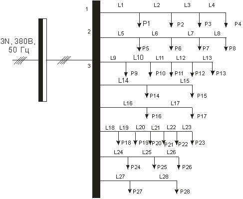Зміст …………………………………………………………………………….…1 Вступ ………………………………………………………………………..….….2 1 СВІТЛОТЕХНІЧНИЙ РОЗДІЛ …………………………………………….….3 1.1 Розрахунок робочого освітлення кормоприємного пункту ………….…..3 1.2 Розрахунок освітлення входів …………………………………….…….…..6 2 ЕЛЕКТРОТЕХНІЧНИЙ РОЗДІЛ……………………………….……………. 9 2.1 Вибір напруги та схеми живлення ……………………….…….…………..9 2.2 Розмітка на плані приміщення місць установки світильників, розеток, вимикачів …………………………………………………………………………9 2.3 Вибір місць установки групових освітлювальних щитів ……………….10 2.4 Вибір трас прокладання освітлювальної мережі………………………….10 2.5 Вибір марок проводів і спосіб їх прокладання…………………………..11 2.6 Розрахунок площі поперечного перерізу проводів освітлювальної мережі…………………………………………………………………………….11 2.6.1 Розрахунок площі проводів за допустимою втратою напруги (за мінімум провідникового матеріалу)…………………………………………………….12 2.6.2 Перевірка вибраної площі перерізу по умовам нагріву і механічної стійкості…………………………………………………………………………16 2.7. Вибір комутаційної і захисної апаратури ………………………….…..17 2.8 Заходи з техніки безпеки при експлуатації електрообладнання………18 Література………………………………………………………………………20 Вступ Неможливо уявити собі сучасну виробничу діяльність людей в темний час доби без електричного освітлення. Тепер чіткіше проявляється тенденція до збільшення долі споживання електричної енергії в освітлювальних та опроміню- вальних установках. Раціонально спроектовані і грамотно здійснені освітлювальні установки дозволяють суттєво збільшити продуктивність труда та якості продукції без значних витрат матеріальних та грошових ресурсів. На даний час більше 15% загальної витрати електроенергії в сільськогосподарському виробництві приходиться на освітлювальні та опроміню- вальні установки, при використанні яких збільшується збереженість поголів’я молока, продуктивність тварині птиці. Раціональне освітлювання знижує травматизм, втрати корма при годуванні, допоміжне опромінювання розсади в теплиці прискорять вихід овочів, збільшується врожайність на 25 – 30% і знижується їх собівартість на 15 – 20% [2]. Промисловість випускає десятки типів джерел оптичного випромінювання, світильників та опромінювачів призначених для використання в сільсько-господарському виробництві. 1 СВІТЛОТЕХНІЧНИЙ РОЗДІЛ 1.1 Розрахунок робочого освітлення кормоприємного пункту ![]() Рисунок 1.1 – План розміщення світильників Вид освітлення – робоче Система освітлення – загальне рівномірне Тип світильника – НСП-02 [1], крива сили світла – М, ІР54 Нормована освітленість – Ен = 50 лк [2] Площина нормування – горизонтальна Рівень розрахункової поверхні – Г-0 Розрахункова висота: Нрозр = Н – hз + hp.п , (1.1) де Н – висота приміщення, м, Н = 3 ; hз – висота звісу світильника, м; hp.п – висота робочої поверхні, м, hp.п = 0. hз = Н – hп.,(1.2) де hп. – висота підвішування світильників над рівням підлоги, м: hп. = 2,5...4м, [1]. Приймаємо hп. = 2.5м. hз = 3– 2.5 = 0.5 м Нрозр = 3 – 0.5 + 0 = 2.5 м Відносно рекомендована відстань між світильниками: Світлотехнічна найбільш вигідна відносна відстань λсв = 1,2 … 1,6; Економічна найбільш вигідна відносна відстань λек = 1,2 …1,6[1]. Рекомендована відстань між світил