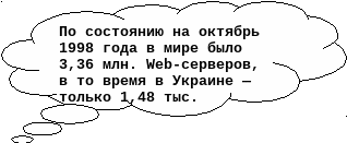 На рис.1 представлена схема связности автономных систем украинского сегмента сети Internet . На рис.2 представлена схема связности провайдеров услуг Internet на Юге Украины. На схеме приведены также значения пропускной способности каналов, организованных между провайдерами. Что касается адресного пространства, то по состоянию на февраль 1999 года в украинском сегменте сети Internet его распределяют тридцать два регистратора локальных ресурсов (LIR — Local Internet Registry), из которых двадцать четыре — резиденты Украины . При этом ими от RIPE получено для распределения двадцать пять блоков сетей /19 , два блока сетей /18 и два блока сетей/16 (т.е. выданного для распределения адресного пространства достаточно для инсталляции в украинском сегменте сети Internet около 200 тыс. хостов). Для сравнения: в российском сегменте Internet адресное пространство распределяет 91 регистратор локальных ресурсов (причем один из них постоянно пытается взять на себя роль регионального регистратора для стран СНГ) и ими получено 164 блока сетей (в том числе двадцать четыре блока сетей /16). Информационные ресурсы украинского сегмента Internet Теперь кратко остановимся на информационных ресурсах сети Internet и ее украинского сегмента. Сейчас все большее число компаний и отдельных пользователей понимают, какие широкие возможности по получению информации для служебных, профессиональных и бытовых потребностей предоставляет Internet. Internet не только обеспечивает доступ к огромным информационным ресурсам, но и значительно повышает производительность труда во многих секторах экономики и науки (простота поиска, оперативность получения информации и обмена данными, доступность экспертных оценок и др.). По некоторым данным, на Web-серверах в Internet сейчас располагается более 200 млн. страниц и каждые 4—6 месяцев этот объем удваивается. А что же в Украине на конец 1999 года? Постоянно прибегать к услугам Internet автор эти строк начал с середины 1995 года, однако систематически изучать особенности развития Internet — только с начала 1997 года. Так вот, на начало 1997 года в Украине было около 250 Web-серверов. В основном это были действительно Web-серверы. Предоставление клиентам возможности размещения их информации на Web-серверах компаний-провайдеров (так называемый хостинг - hosting) еще широко не практиковалось в тот момент в Украине. В середине 1997 года количество Web-серверов возросло до 750. Но это уже были не только «честные» Web-серверы. Значительное количество из них составляли так называемые виртуальные Web-серверы, когда на одном и том же хосте размещается как сервер хозяина хоста, так и сервера клиентов. Какая же информация была в то время на серверах? 43% серверов размещали рекламную информацию о коммерческих предприятиях и предоставляемых ими услугах. 13,5 % серверов знакомили с деятельностью провайдеров услуг Internet, их тарифами и услугами (кстати, на тот момент в украинском сегменте работало 102 провайдера). 24% серверов были сориентированы на широкий круг пользователей (предлагали, например, телефонные справочники, желтые страницы, культурологические и информационно-аналитические сведения и др.). На 6 % серверов находились электронные версии газет и журналов, а на 1,5 % серверов — данные о деятельности органов исполнительной и законодательной власти. Назначение же оставшихся 12 % серверов на момент обследования трудно было определи