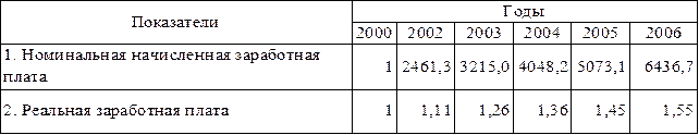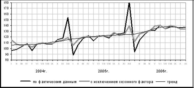 Рис. 2. Реальные располагаемые денежные доходы населения за период 2004-2006 гг. (в % к среднемесячному значению 2003 г.) по России.[4] На сегодняшний день в денежных доходах работника различают: цену труда, затраты работодателя на труд, заработную плату работника. В России сейчас главным элементом государственного механизма регулирования оплаты труда и основой установления заработной платы является минимальный размер оплаты труда (МРОТ). Он представляет собой гарантируемый государством размер месячной заработной платы за труд неквалифицированного работника, отработавшего норму рабочего времени при выполнении простых работ в нормальных условиях труда. МРОТ характеризует нижнюю границу цены труда, должен быть достаточным для удовлетворения наиболее значимых физиологических и социальных потребностей одинокого работника и не несет в себе иждивенческой нагрузки. Поэтому теоретически МРОТ приравнивается прожиточному минимуму взрослого трудоспособного человека. Прожиточный минимум — это показатель объема структуры потребления важнейших материальных благ и услуг на минимально допустимом уровне, обеспечивающий условия для поддержания активного физического состояния взрослых, социального и физического развития детей и подростков. Он определяет "потребительскую корзину" и включает минимальный набор продуктов питания, непродовольственных товаров и услуг, необходимых для сохранения здоровья человека и обеспечения его жизнедеятельности. Величина прожиточного минимума определяется с учетом: ¾ научных рекомендаций по минимальным объемам потребления и перечню товаров и услуг, необходимых для человека; ¾ фактического объема потребления товаров и услуг в малоимущих семьях; ¾ социально-экономических и демографических факторов, формирующих уровень денежных доходов населения, состава и половозрастной структуры населения, размеров и структуры семей, финансовых возможностей государства по обеспечению социальной защиты населения. Прожиточный минимум в стране дифференцируется по следующим основным социально-демографическим группам населения: а) трудоспособное население; б) пенсионеры; в) дети. Он различается по территориальным зонам (16 зон по потреблению продуктов питания, 3 зоны по непродовольственным товарам индивидуального пользования и 3 зоны по набору услуг), а также с учетом коэффициента семейности. В структуре прожиточного минимума отражены: расходы на питание, непродовольственные товары, услуги, а также налоги и другие обязательные платежи. Новая потребительская корзина (принятая в 2006г.) по сравнению с прежней (2004г.) содержит иной качественный состав продуктов питания: в ней сокращено число углеводосодержащих продуктов и увеличено число продуктов, содержащих витамины. МРОТ в России сейчас исполняет роль технического норматива для расчета социальных выплат — пенсий, пособий, стипендий и т. п. Причем ведущая роль заработной платы по отношению к пенсии определяет Следующее примерное соотношение минимального размера оплаты труда к минимальной пенсии — 1:0,7. Пока МРОТ служит основой, на которой строится система государственного обеспечения социальных гарантий населения в сфере доходов. Считается, что такая роль несвойственна МРОТ и в перспективе она будет изменена. Вместо него будет использоваться средняя зар