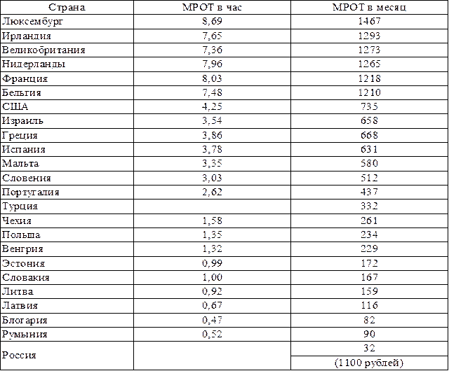В зарубежных странах государственный МРОТ регулярно пересматривается с учетом уровня инфляции и других факторов. Например, во Франции разработан механизм, предусматривающий автоматический рост размера МРОТ при росте цен на 2 %. В США МРОТ изменяется по мере необходимости, но законодательством не предусмотрены государственные обязательства по его пересмотру. В целом, регулирование МРОТ осуществляется на основе законов (США, Франция, Испания и др.) и соглашений (Великобритания, Германия, Италия и др.). Определенное воздействие на доходы трудящихся оказывают фонды потребления, т. е. соответствующие социальные выплаты или социальные фонды государства и предприятий. В странах Западной Европы размер минимальной месячной зарплаты превышает российский в десятки раз, составляя в среднем от 400 до 1500 евро, напомним, что в России минимальный размер оплаты труда (МРОТ) составляет 1100 рублей в месяц (эквивалентно примерно 32 евро) (табл. 6). По типу регулирования минимальной заработной платы экономически развитые страны можно разделить на две группы. К первой относятся те, где минимальная заработная плата устанавливается законодательно (например, Испания, Ирландия, Греция, Япония и др.). А в таких государствах, как Германия, Австрия, Италия, Финляндия, Норвегия, Швеция, Швейцария, общегосударственного размера минимальных гарантий оплаты труда нет. Минимальная ставка определяется в коллективных соглашениях в разных секторах экономики. В этих государствах говорят о минимальной зарплате в строительной отрасли, в здравоохранении, у транспортников, но не о минимальной зарплате в целом по стране. Особенностью МРОТ в Европе и Америке является то, что рассчитывается он не только за месяц, но и за день и даже за час (а кое-где и только за час). Например, в Ирландии официально существующий МРОТ равняется 6,35 евро в час. В Соединенных Штатах он равняется 6 долл. в час, но к 2009 г. должен быть увеличен до 7,25 долл. "В Финляндии сумма минимальной оплаты труда оговаривается в трудовом договоре отдельно для каждой сферы. Но тем не менее есть общие минимальные нормы. С 01.01.2006 г. размер минимальной зарплаты за месяц составляет 940 евро, за день - 43,72 евро, за час - 5,46 евро", - рассказывает Тарья Тиирикайнен, директор представительства Финско-Российской торговой палаты в Петербурге. Рекордсменом же по степени заботы о своих гражданах является Люксембург. Любой работающий гражданин этой крошечной страны может рассчитывать на месячный минимум в 1503 евро. Российский же МРОТ является самым низким в Европе. Для сравнения: даже наш сосед - Украина - гарантирует своим гражданам минимальную зарплату в 483 гривны (приблизительно 77 евро). По замыслу российских законодателей МРОТ должен был способствовать установлению социальной справедливости и предотвращению произвола работодателей по отношению к наемным работникам. Однако в нашей стране он выполняет скорее декоративную функцию. Предполагалось, что эталоном организации заработной платы в России должна служить бюджетная сфера, на которую следовало ориентироваться хозяйствующим субъектам других форм собственности. Для организаций и учреждений бюджетной сферы государственная ЕТС до 2005 г. являлась документом прямого действия, а для предпринимательского сектора — лишь рекомендацией. Далее в табл. 7, 8 представлены динамика та