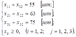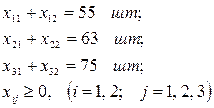 Ограничения Возможные объемы производства продукций станками ограничиваются следующими условиями: · общее количество продукции П1, выпущенное обеими станками, должно равняться 55 шт., продукции П2 - 63 шт., продукции П3 – 75 шт; · объемы производства изделий не могут быть отрицательными величинами.