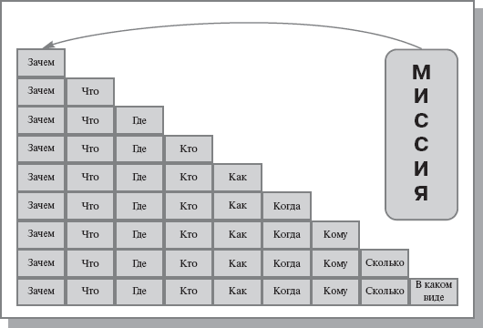Рис. 4.2. Основные этапы процессно-целевого описания компании Полная бизнес-модель компании - это совокупность функционально ориентированных информационных моделей, обеспечивающая взаимосвязанные ответы на следующие вопросы: "зачем" - "что" - "где" - "кто" - "сколько" - "как" - "когда" - "кому" (рис. 4.3).