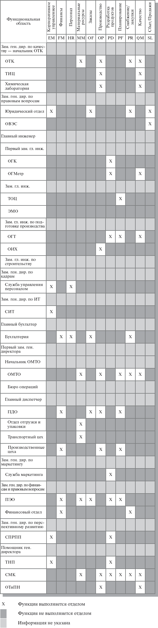 Главной функцией компании является предоставление продуктов и услуг, поэтому сначала производится формальное описание, согласование и утверждение руководством предприятия перечня его бизнесов (направлений коммерческой деятельности), продукции и услуг. Из этого классификатора внешним контрагентам должно быть понятно, чем предприятие интересно рынку, а для внутренних целей - для чего нужен тот или иной функционал компании. В результате этих операций производится идентификация функционала и создается единая терминология описания функций предприятия, которая должна быть согласована всеми ведущими менеджерами. При составлении классификатора оргзвеньев важно, чтобы уровень детализации функций соответствовал уровню детализации звеньев. После формирования всех базовых классификаторов с помощью матричных проекций производится их закрепление за оргзвеньями предприятия: Процесс формирования матрицы проекций функций на оргзвенья на практике напоминает игру в крестики-нолики (рис. 4.10). По строчкам таблицы указываются подразделения, по столбцам - функции, составляющие содержание процесса управления или бизнес-процесса в данной компании. На пересечениях функций и подразделений, которые ответственны за выполнение функции, ставится крестик. Для проекций большой размерности используется механизм расстановки связей между двумя классификаторами, представленных списками. Стандартная практика построения моделей организационно-функциональной структуры компаний поддерживает два уровня детализации: