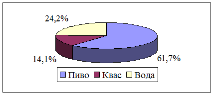 По данным таблицы видно, что значительную долю в объеме производства занимает пиво. В 2005 году компания специализировалась на производстве пива и кваса. Затем, начиная с 2006 года, в целях увеличения объёма производства, и, как следствие, увеличение выручки от реализации продукции, предприятие стало производить безалкогольные напитки. Производство кваса и воды наращивает темпы, и в 2007 году составило 38,3 % от общего объема продукции, в т.ч. производство кваса – 14,1 %, воды – 24,2 % (см. рис.2.1). Общий объём производимой продукции с каждым годом увеличивается. Так, в 2007 году выпуск продукции увеличился в 1,8 раз по сравнению с 2005 годом.