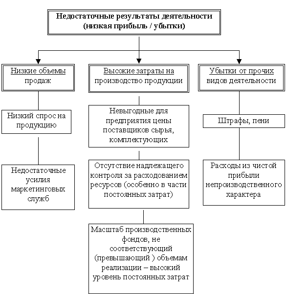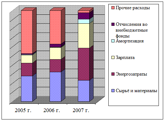 Данные таблицы свидетельствуют о том, основная деятельность, ради осуществления которой было создано предприятие, за весь анализируемый период была убыточной. В 2005 году этот убыток был покрыт за счет доходов от операционной и внереализационной деятельности, и предприятие получило чистую прибыль в сумме 1 140 тыс. руб. В 2006 году предприятие несет убытки от основной деятельности в размере 7 617 тыс. руб. и от внереализационной деятельности в размере 91 тыс. руб., что неблагоприятно влияет на его финансовые результаты. Прибыль предприятию в 2006 году приносит только операционная деятельность (3 748 тыс. руб.). Она не может покрыть все убытки, и чистый убыток предприятия составил 3 960 тыс. руб. В 2007 году мы наблюдаем убытки от всех видов деятельности предприятия, в сумме они составили 12 035 тыс. руб., что в 3 раза больше чистого убытка в 2006 году. Убыточность предприятия от основной деятельности связана с большими коммерческими и управленческими расходами, а также высокой себестоимостью реализованной продукции. Так себестоимость продукции в 2007 году выросла почти в 2 раза по сравнению с 2005 годом и составила 14 490 тыс. руб. В первую очередь это обусловлено тенденцией повышения за последние годы цен на пивоваренный солод и ростом затрат на заработную плату работникам. Как следствие этого, эффективность основной деятельности предприятия снизилась под влиянием опережающего темпа роста себестоимости реализованной продукции (197 %) по отношению к темпу увеличения выручки (181 %). Из-за высокой себестоимости снизилась и валовая прибыль. Так, в 2007 году она составила 1498 тыс. руб., что в 2,4 раза меньше, чем в 2006 году. Уровень рентабельности продаж на предприятии в 2005 году составил 20 %. Это означает, что предприятие с каждого рубля реализованной продукции получило 20 руб. прибыли. Уровень окупаемости затрат в 2007 году составил 65 %. Это означает что полученная выручка от реализации продукции в размере 15 988 тыс. руб. покрыла лишь 65 % затрат на производство и реализацию продукции. Убыточность предприятия от операционной и внереализационной деятельности в 2007 году связана с превышением расходов над доходами. Таким образом, за последние 2 года деятельность предприятия убыточна, необходимо искать причины убыточности и резервы увеличения прибыли. Основными резервами роста прибыли являются увеличение объема реализованной продукции, снижение ее себестоимости, повышение качества товарной продукции, реализация ее на более выгодных рынках и т.д. Причины убыточности исследуемого предприятия можно отразить в виде следующей схемы (см. рис. 2.2). Из рисунка видно, что одной из причин убыточности ООО «Пивоваренный завод «Орский» являются высокие затраты на производство продукции. Следовательно, целесообразно рассмотреть, из каких же затрат складывается себестоимость производимой на предприятии продукции.