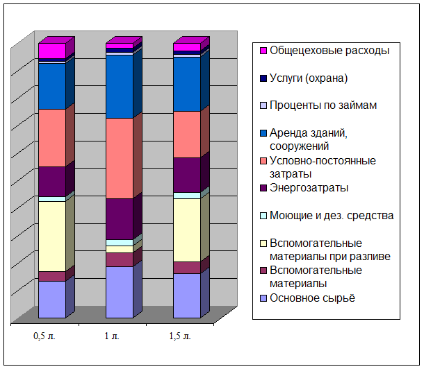 По данным таблицы за исследуемый период прослеживается тенденция повышения затрат на производство и реализацию продукции. Постоянный рост расходов приводит к увеличению себестоимости производимой продукции, что негативно сказывается на финансовом результате предприятия. Так, прирост всех затрат в 2007 году (за базу взят 2005 год) составил 54 %. Это вызвано, в первую очередь, ростом материальных затрат и заработной платы. Так, в 2007 году материальные затраты увеличились в 2,15 раза по сравнению с 2005 годом. При этом мы наблюдаем снижение затрат на сырьё и материалы на 1 478 тыс. руб. и увеличение энергозатрат на 5 756 тыс. руб. по сравнению с 2006 годом. Затраты на оплату труда работникам по сравнению с 2005 годом увеличились в 4,69 раз, что так же отражается на себестоимости продукции. Резко увеличились затраты на амортизацию и отчисления во внебюджетные фонды, значения этих показателей в 2007 году превысили значения 2005 года более чем в 11 раз, но хотя темп роста этих затрат так велик, они не являются значительными в структуре себестоимости продукции. Как видно из рисунка 2.3, около 60 % всех затрат в 2007 году принадлежит материальным затратам, из них на долю энергозатрат приходится 35 %. Второе место в структуре себестоимости в 2007 году принадлежит заработной плате (27 %). На долю остальных затрат (амортизация, отчисления во внебюджетные фонды и прочие расходы) приходится 13 %. Рисунок 2.3 – Структура себестоимости валовой продукции ООО «Пивоваренный завод «Орский» Итак, мы рассмотрели динамику затрат по экономическим элементам и охарактеризовали структуру валовой себестоимости продукции. Теперь сгруппируем затраты по статьям калькуляции (Приложение Д), это позволит нам определить себестоимость единицы продукции. В качестве объекта калькуляции возьмём пиво «Жигулёвское» объёмом 0,5, 1 и 1,5 литра. Таблица 2.9 – Состав и структура затрат на производство пива «Жигулёвское» по статьям калькуляции