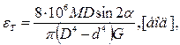 где М — измеряемый крутящий момент, Нм; D — наружный диаметр вала, мм; d — внутренний диаметр вала, мм; a — угол между осью наклонного тензорезистора и образующей вала; G — модуль сдвига, ГПа.