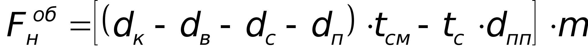 где dк,dв,dс,dп,dпп - количество дней (календарных, воскресных, субботних, праздничных, предпраздничных) в году; tсм - продолжительность смены, час; tс- время сокращения смены, 1час; m- количество смен.