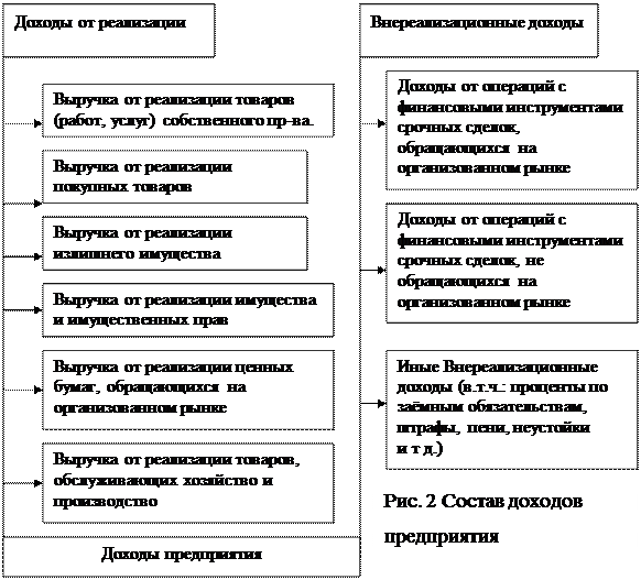 Рис.4 Формирование финансовых результатов 1.3.3. СОСТАВ, СТРУКТУРА И ДИНАМИКА БАЛАНСОВОЙ ПРИБЫЛИ ПРЕДПРИЯТИЯ Финансовые результаты деятельности предприятия оцениваются с помощью абсолютных и относительных показателей. К абсолютным показателям относятся: - прибыль (убыток) от реализации продукции (работ, услуг) - прибыль (убыток) от прочей реализации - доходы и расходы от внереализационных операций - балансовая (или валовая) прибыль - чистая прибыль. В качестве относительных показателей используют различные соотношения прибыли и затрат (или вложенного капитала собственного, заёмного, инвестируемого ит.д.) Эту группу показателей называют также показателями рентабельности. Экономический смысл показателей рентабельности состоит в том, что они характеризуют прибыль, получаемую ч каждого рубля капитала (собственного или заемного), вложенного в предприятие. Рассмотрим основные финансовые результаты, определяемые абсолютными величинами, в числе которых присутствует балансовая прибыль. Выручка от реализации (валовой доход) - общий финансовый результат от реализации продукции (работ, услуг). Включает в себя: ~ выручку от реализации готовой продукции (работ, слуг) ~ строительных, научно-исследовательских работ ~ товаров, приобретенных для последующей продажи ~ услуг по перевозке грузов и пассажиров на предприятиях транспорта и т.д. Валовая прибыль от реализации - разница между выручкой от реализации продукции (работ, услуг) без налога на добавленную стоимость и акцизов и затратами на производство реализованной продукции (работ, услуг). Общий финансовый результат (прибыль, убыток) на отчетную дату, который называют балансовой прибылью, получают путем расчета общей суммы всех прибылей и всех убытков от основной и неосновной деятельности предприятия. В балансовую прибыль включают: ~ прибыль (убыток) от реализации продукции (работ, услуг) ~ прибыль (убыток) от реализации товаров ~ прибыль (убыток) от реализации материальных оборотных средств и других активов. ~ прибыль (убыток) от реализации и прочего выбытия основных средств ~ доходы и потери от валютных курсовых разниц ~ доходы от ценных бумаг и других долгосрочных финансовых вложений, включая вложения в имущество других предприятий ~ расходы и потери, связанные с финансовыми операциями ~ внереализационные доходы (потери). Балансовая прибыль за минусом налогов (обязательных платежей) называют чистой прибылью. 1.4.СОСТАВ, СТРУКТУРА И ДИНАМИКА НАЛОГОВ С ПРЕДПРИНИМАТЕЛЬСКОЙ ДЕЯТЕЛЬНОСТЬЮ ПРЕДПРИЯТИЯ. Налогообложение предприятия ООО «Пашутинский ЛПХ» Налоги по уровню установления подразделяются: - на федеральные - устанавливается налоговым кодексом и взимается на всей территории РФ (НДС, НДФЛ, ЕСН, налог на прибыль организации, водный налог, государственная пошлина); - на региональные - вводится законами субъектов РФ в соответствии с перечнем региональных налогов, приведенных в налоговом кодексе, и взимаются на территории конкретного субъекта РФ (налог на имущество организаций, транспортный налог); - на местные - вводится решением представительных органов власти самоуправления в соответствии с перечнем местных налогов приведенных в налоговом кодексе, и взимаются на территории конкретного города или района(земельный налог, налог на имущество физических лиц). Налог на доходы с физическ