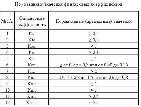 где Ав — внеоборотные активы (стр. 190 бухгалтерского баланса). Тютюкина Е. Б. [28] подчёркивает, что перечисленные показатели ликвидности не только дают разностороннюю характеристику устойчивости финансового состояния организации при разной степени учёта ликвидных средств, но и отвечают интересам различных внешних пользователей аналитической информации. Так, для поставщиков наиболее интересен коэффициент абсолютной ликвидности. Банк, кредитующий данные организации, больше внимания уделяет коэффициенту критической ликвидности. Покупатели и держатели акций и облигаций организации оценивают финансовую устойчивость организации в основном по коэффициенту текущей ликвидности. Нормативные значения финансовых коэффициентов представлены в таблице 2. Таблица 2.