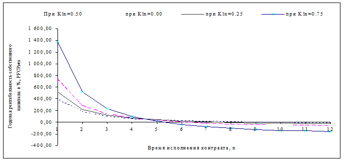 Данные кривые представляют собой кривые безразличия заемного капитала, каждая точка на которых представляет собой сочетание процентной ставки RT, коэффициента заимствования Kln и срока кредитования n (совпадающего со сроком исполнения контракта), образующее вместе вектор заимствования LN ( RT; Kln;n), определяющий условия заимствования для данного контракта, при которых значения годовой рентабельности собственного капитала