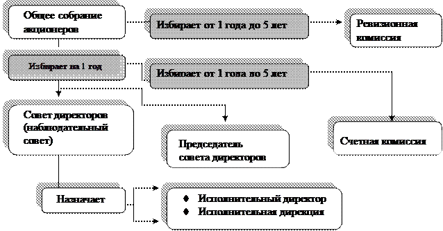 Рисунок 1 Схема органов управления акционерного общества Схема с включением в нее названных органов управления представлена на рис.1 Собрание акционеров является высшим органом управления обществом. Именно через участие в нем владельцы голосующих акций реализуют право на участие в управлении делами общества. Однако собрание акционеров может рассматривать и принимать решения только по тем вопросам, которые отнесены к его компетенции Федеральным законом, причем перечень вопросов не может быть расширен по усмотрению самих акционеров. Общее собрание акционеров избирает совет директоров и его председателя. Совет директоров назначает единоличный, а при необходимости – и коллегиальный исполнительный орган. В соответствии с данными обследований число членов совета директоров в среднем равно 7 человек, причем имеет тенденцию к уменьшению. Таким образом, Закон об акционерных обществах, определив максимально допустимый набор органов управления, оставил акционерам возможность выбора вариантов их компоновки. В России, согласно сделанным экспертами оценкам роли базовых органов управления обществом в принятии корпоративных решений, совет директоров превосходит по влиянию собрание акционеров. Заключение Акционирование не только достаточно быстро мобилизует капиталы и порождает многообразие способов их объединения. Оно также способствует демократизации экономики и оказывает существенное влияние на социальные процессы, превращая широкий слой людей в совладельцев собственности, получающих право управлять деятельностью предприятия и участвовать в распределении прибыли. Акционерная собственность - это закономерный результат процесса развития и трансформации частной собственности, когда на определенном этапе развития масштабы производства, уровень технологии, система организации финансов создают предпосылки для принципиально новой формы организации производства на базе добровольного участия акционеров. Акционерная форма позволяет привлечь в одно предприятие капиталы многих лиц, причем даже тех, которые сами не могут в силу самых разных причин заниматься предпринимательской деятельностью. Кроме того, ограничение ответственности размером внесенного капитала вместе с высокой его диверсификацией позволяет вкладывать средства в весьма перспективные, но и высоко рискованные проекты, существенно ускоряя внедрение достижений научно-технического прогресса. Есть много других положительных сторон акционерной формы собственности, делающих ее поистине универсальной и применимой везде, где для организации предприятия требуется начальный капитал и есть необходимость и возможность ограничить масштабы ответственности предпринимателя. Последнее обстоятельство особенно важно в условиях нестабильной экономики, расстройства хозяйственных связей, неуверенности в завтрашнем дне, когда непредвиденная остановка производства может привести к огромным убыткам, долгам, на погашение которых может не хватить даже всего имеющегося имущества. Подобной опасности подвергаются арендные коллективы, индивидуальные предприниматели, товарищества с неограниченной ответственностью. Акционерные общества позволяют более эффективно использовать материальные и людские ресурсы, оптимально сочетать личные и общественные инт