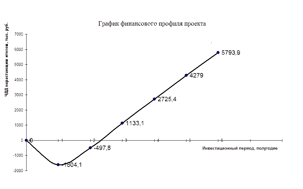 Полученное значение ЧДД нарастающим итогом неотрицательное и составило 5793,9 тыс. руб. На основе произведенных расчетов построим финансовый профиль проекта (рис.4.1). Индекс доходности определяем по формуле (1.8) на основе данных табл.4.21: ИД=(0+11970*0,951+15461,3*0,928+15461,3*0,906+15461,3*0,884+15461,3* 0,862)/ (740*0,975+9904,5*0,951+12801,6*0,928+12801,6*0,906+12801,6*0,884+ +12801,6*0,862)= 66734,9/55970,4=1,19 Рассчитанное значение индекса доходности превышает единицу. Следующий показатель эффективности инвестиционного проекта, который необходимо рассмотреть, - внутренняя норма доходности (ВНД). Нахождение ВНД является трудоемким процессом, поэтому определим её с помощью подбора (табл. 4.22). Подбор осуществляется на основе условия равенства чистого дисконтированного дохода нарастающим итогом нулю. Таблица 4.22 Определение внутренней нормы доходности